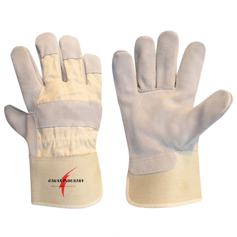 Beige Cowhide Leather Palm and Back Knuckle Palm, Red Drill Cotton Fabric Back - Rubberized Safety Cuff, Extra Inside Fleece Lining Palm,