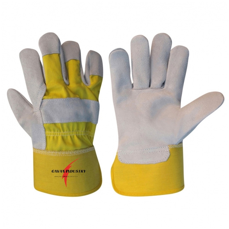 Beige Cowhide Leather Palm and Back Knuckle Palm, Yellow Drill Cotton Fabric Back - Rubberized Safety Cuff, Extra Inside Fleece Lining Palm,