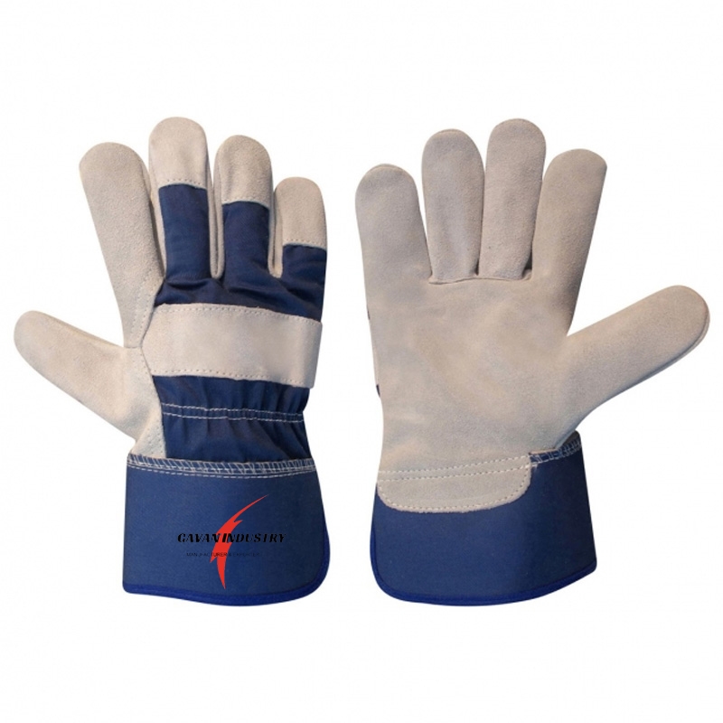 Beige Cowhide Leather Patch Palm and Back Knuckle Palm, Striped Cotton Fabric Back - Rubberized Safety Cuff,